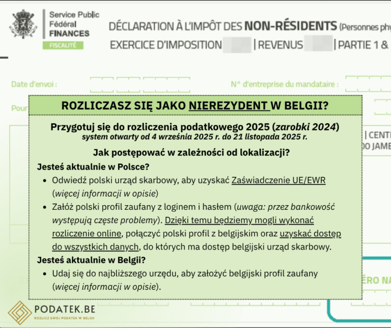 Przygotowania do rozliczenia podatkowego za rok 2024 System rozliczeń podatkowych w Belgii za rok 2024 zostanie otwarty 4 września 2025 roku i będzie czynny do 21 listopada 2025 roku. W zależności od twojego aktualnego miejsca zamieszkania, sposób postępowania może się…